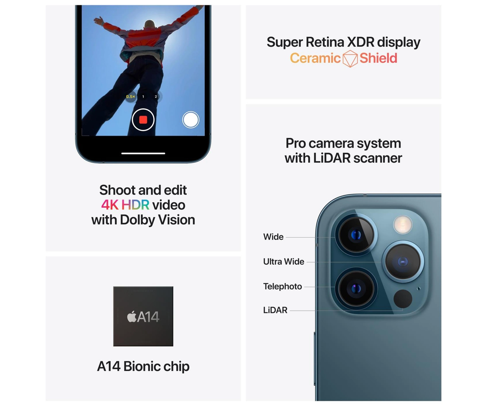 5G zadebiutowało w wersji Pro. A14 Bionic zdecydowanie wyprzedza chipy w innych smartfonach. Profesjonalny system aparatów przenosi zdjęcia słabo oświetlonych scen na wyższy poziom, a iPhone 12 Pro jeszcze bardziej je udoskonala. Ceramic Shield nawet czterokrotnie zwiększa odporność na upadki. Oto nowa seria iPhone'a Pro.