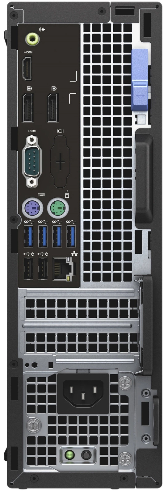 Dla najbardziej wymagających użytkowników Dell stworzył desktopy Optiplex serii 7000. Konstrukcje występują w trzech obudowach: MFF, SFF oraz MT. Najmniejsza dysponuje dwoma portami na moduły RAM, większe posiadają po cztery gniazda. W panelach tylnych znajdziesz po cztery porty USB 3.0, a w dużych obudowach również porty USB 2.0. Ulokowano tam ponadto złącza LAN, porty HDMI oraz opcjonalnie, jeden lub dwa porty Display Port. Obudowy SFF i MT posiadają również po dwa złącza PS/2 oraz po jednym RS-232.