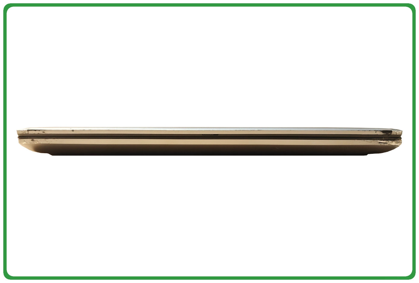 ✅ Stan wizualny dobry, laptop posiada wadę w postaci wgniecionej frontowej części klapy dolnej i kadłubka z lewej oraz z prawej strony, dodatkowo posiada pękniętą ramkę ekranu, wady te są jedynie wizualne i nie wpływają na pracę laptopa. Matryca bez widocznych wad..