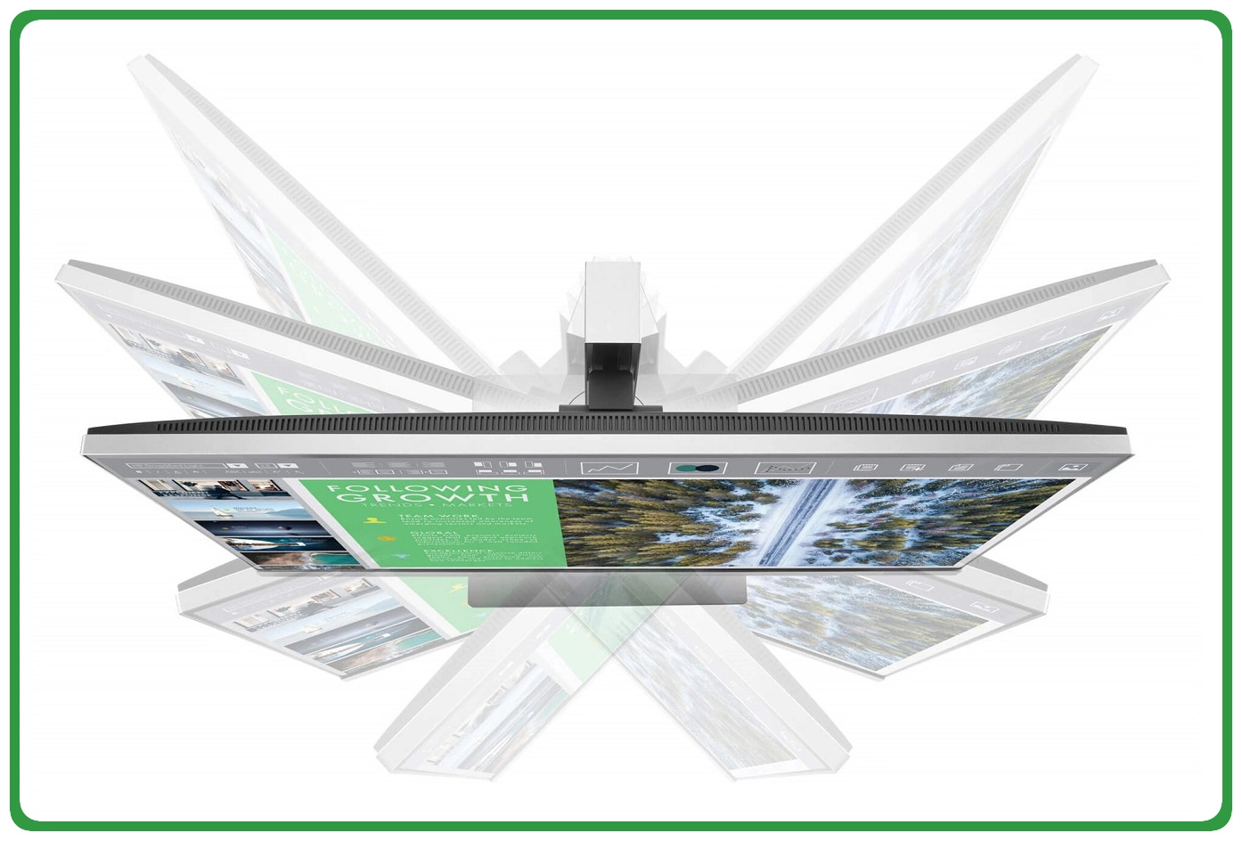Pracuj w najwygodniejszej dla siebie pozycji oraz zwiększaj swoją produktywność, dostosowując nachylenie, wysokość, obrót oraz regulację w pionie (maks. 150 mm). Możliwość obrotu w płaszczyźnie pionowej pozwala dostosować widok w pionie lub w poziomie podczas korzystania z wielu monitorów.