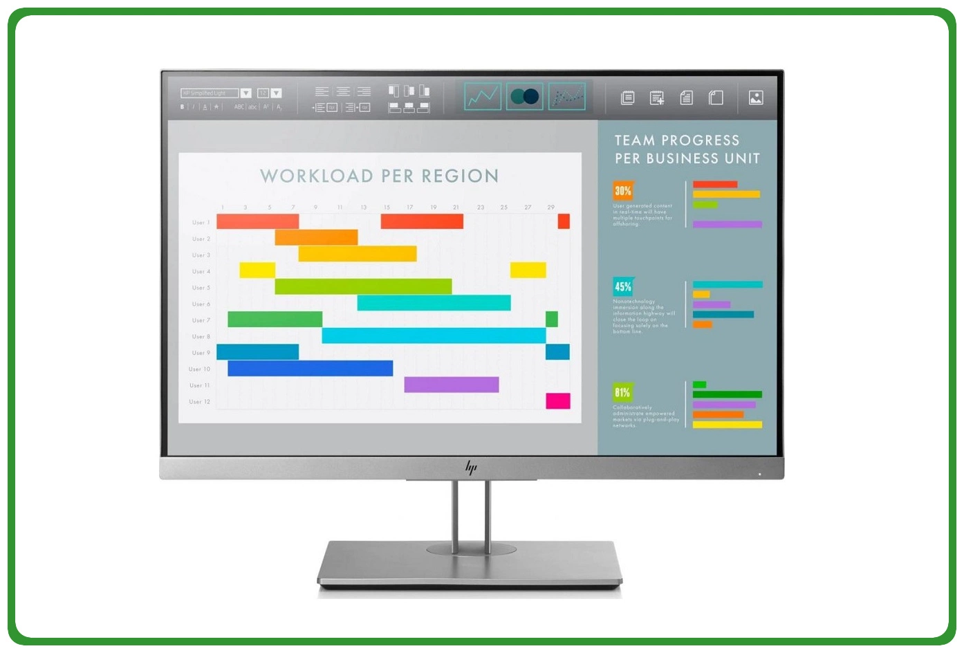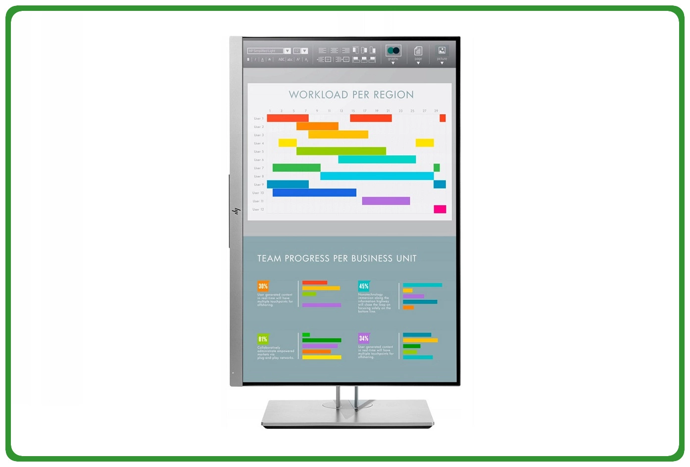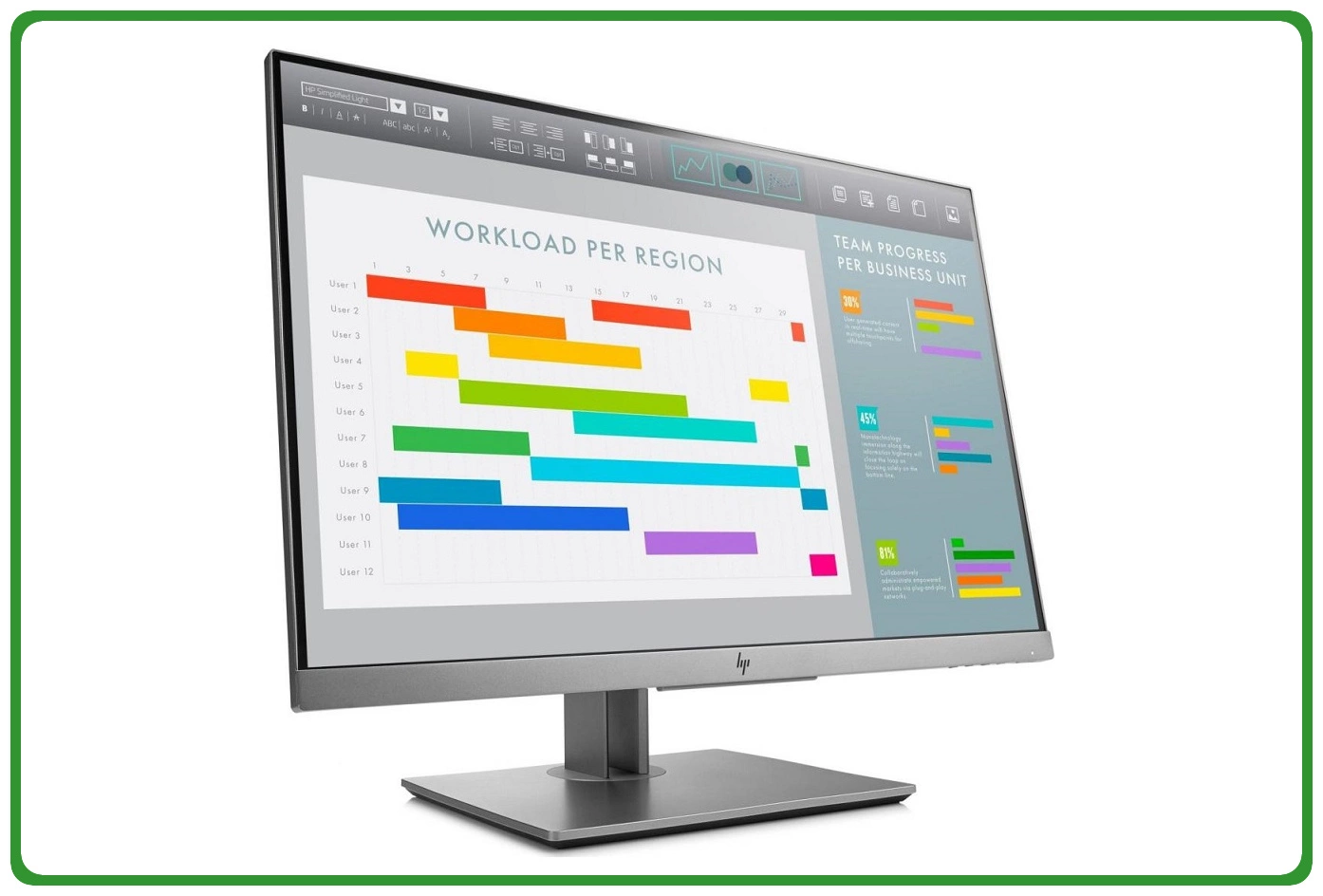 Duży ekran i wysoka rozdzielczość monitora HP EliteDisplay E243i doskonale sprawdzą się do zastosowań biznesowych. Matryca oferuje przestrzeń roboczą wystarczającą do sprawnej pracy, nawet z dużymi arkuszami. Dzięki temu widzisz wszystkie dane bez konieczności przewijania, co ułatwia i przyspiesza pracę. Co więcej, wysoka rozdzielczość zapewnia ostry jak brzytwa obraz, który pokochają Twoje oczy.