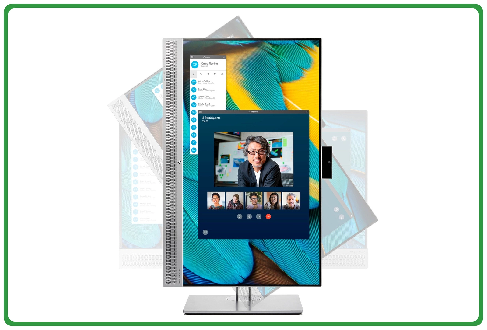 Bierz udział w wideokonferencjach ze współpracownikami w tym samym budynku i na całym świecie dzięki monitorowi z certyfikatem Skype for Business®. Wyposażony w kamerę internetową HD, ma również fachowo dostrojony system dźwięku Audio by Bang & Olufsen, mikrofon oraz przyciski konferencyjne do kontrolowania połączeń z menu ekranowym.