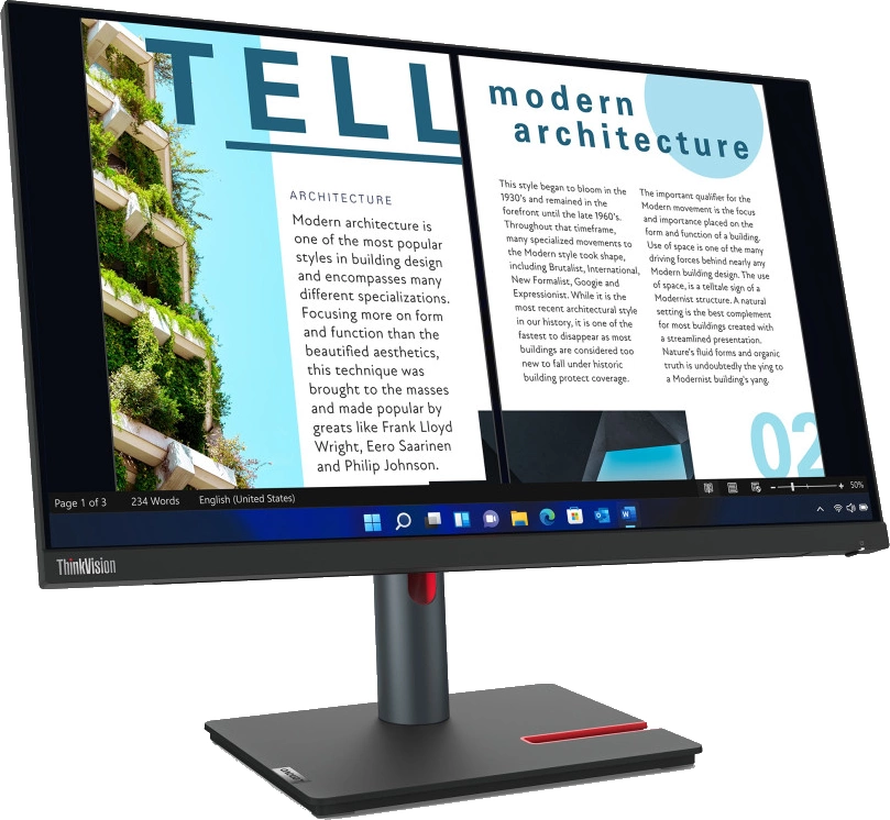 Smukła, niemal bezramkowa konstrukcja monitora Lenovo ThinkVision P24h-30 nie tylko wygląda nowocześnie, ale także umożliwia łączenie kilku ekranów w zestawach wielomonitorowych. Ergonomiczna podstawa ze zintegrowanym uchwytem na telefon i systemem zarządzania kablami pozwala utrzymać porządek na biurku, a opcja montażu VESA daje pełną elastyczność ustawienia. To sprzęt, który nie tylko świetnie wygląda, ale również ułatwia codzienną organizację pracy.