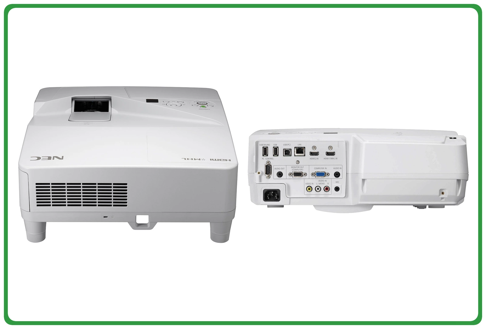 Projektor NEC UM351W oferuje szeroki wachlarz wejść, w tym dwa porty HDMI, VGA, USB oraz złącza wideo, co zapewnia łatwe podłączenie różnych urządzeń zewnętrznych. Dzięki wsparciu dla MHL przez HDMI, użytkownicy mogą nie tylko przesyłać obraz z kompatybilnych urządzeń mobilnych, ale także je ładować, co zwiększa komfort użytkowania i elastyczność w zastosowaniach edukacyjnych i biznesowych.